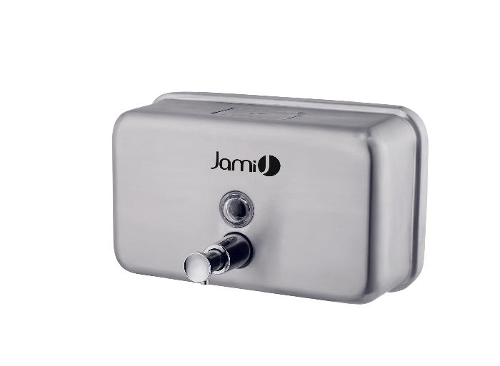 Dispensador de jabón horizontal, de capacidad 1 l, con pulsador manual, visor de llenado y sistema antivandálico. De acero inoxidable aisi 304 en acabado satinado.